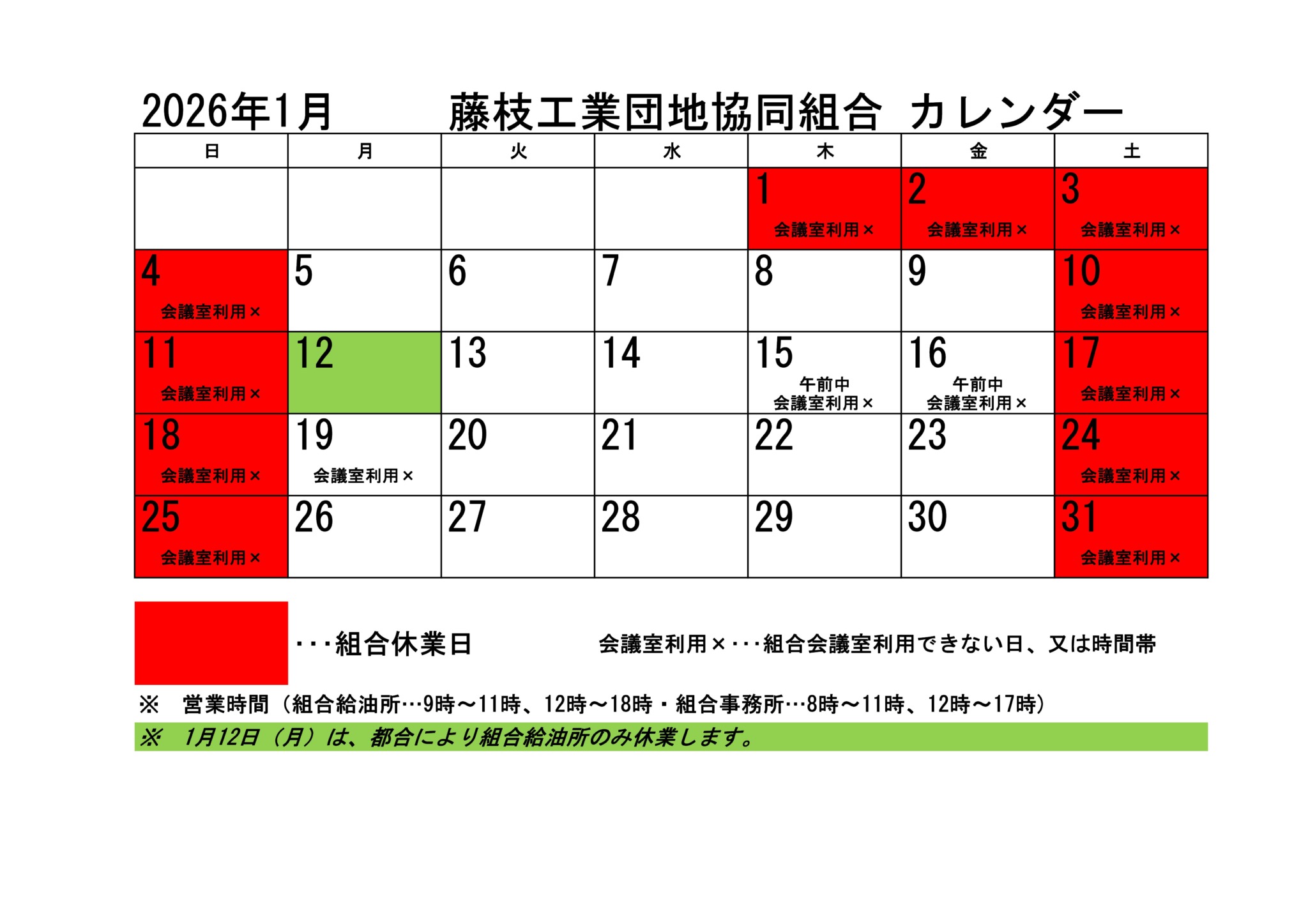 組合事務局より 2026年1月営業日と会議室利用状況のお知らせ